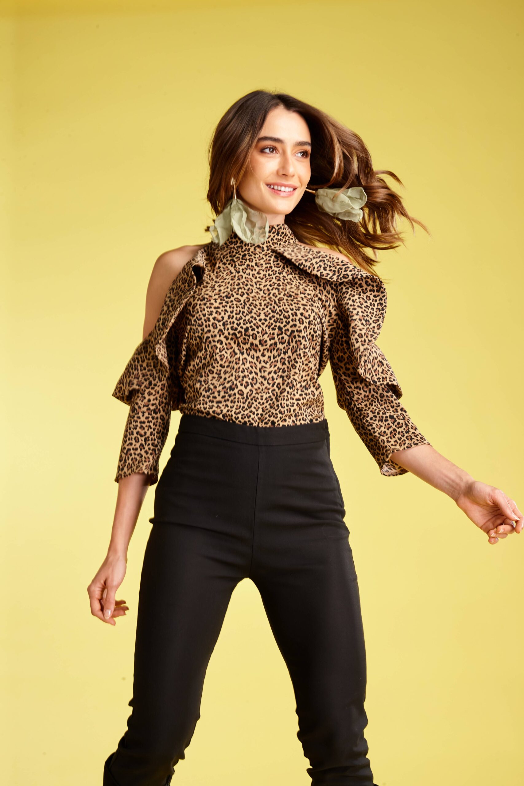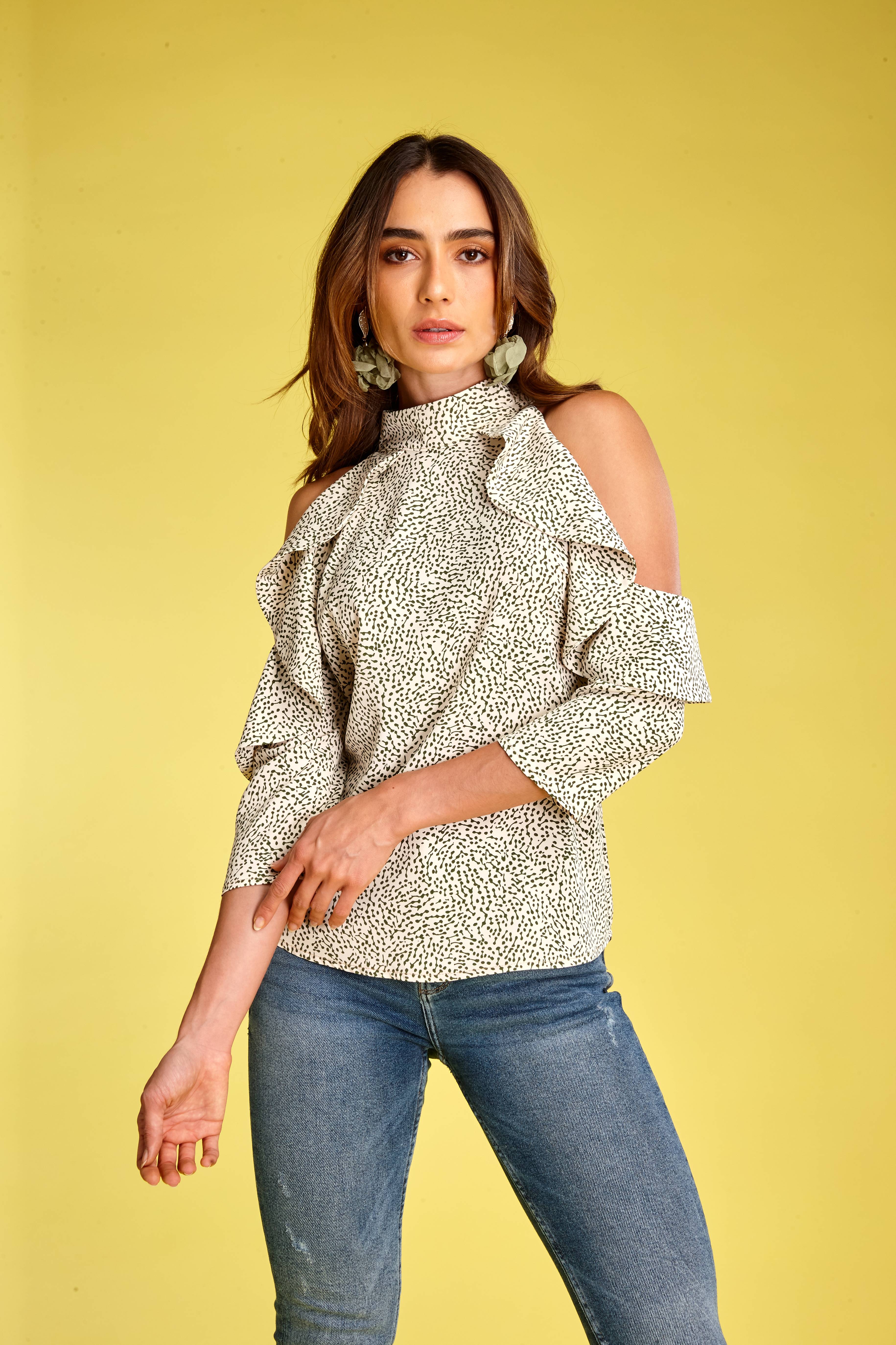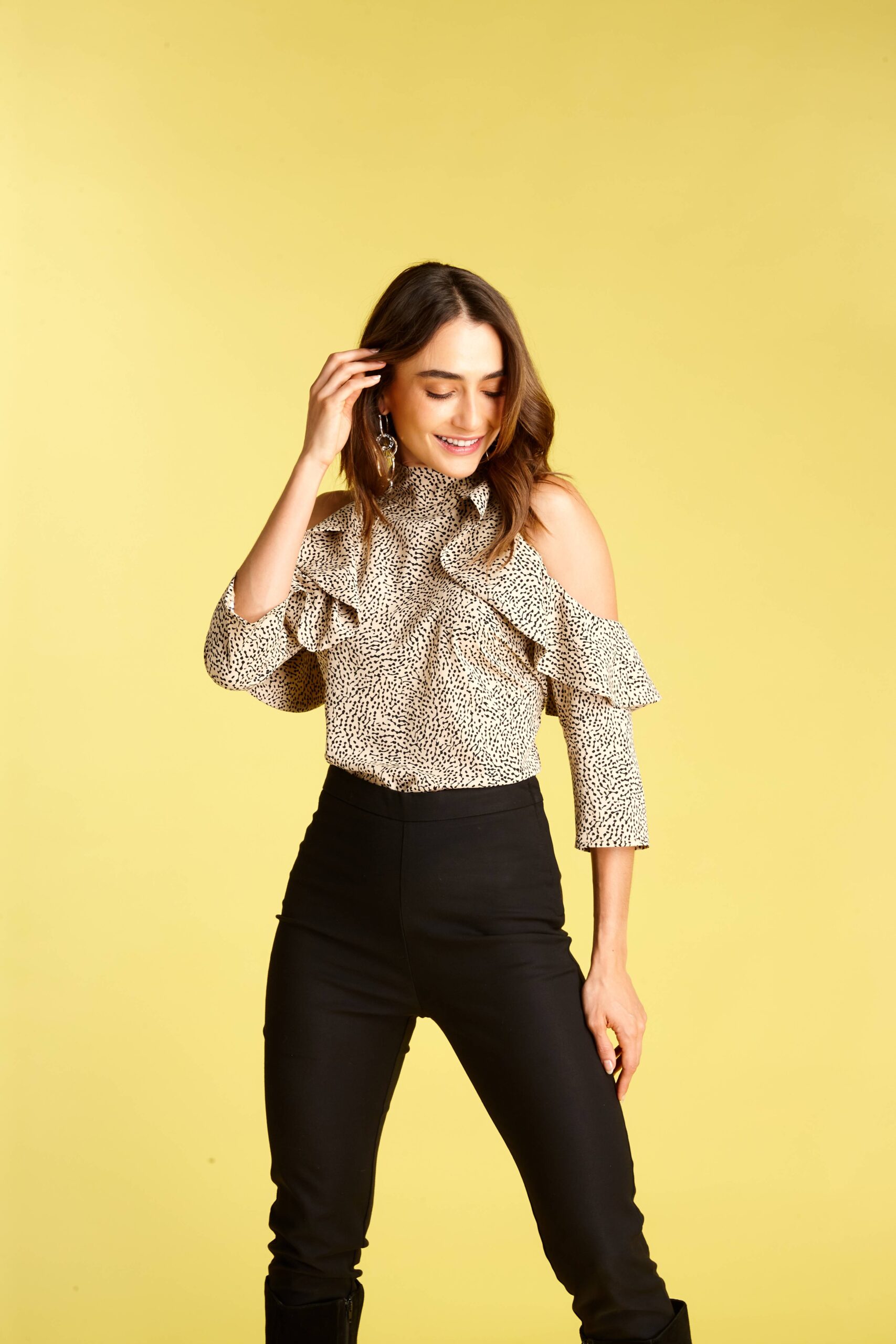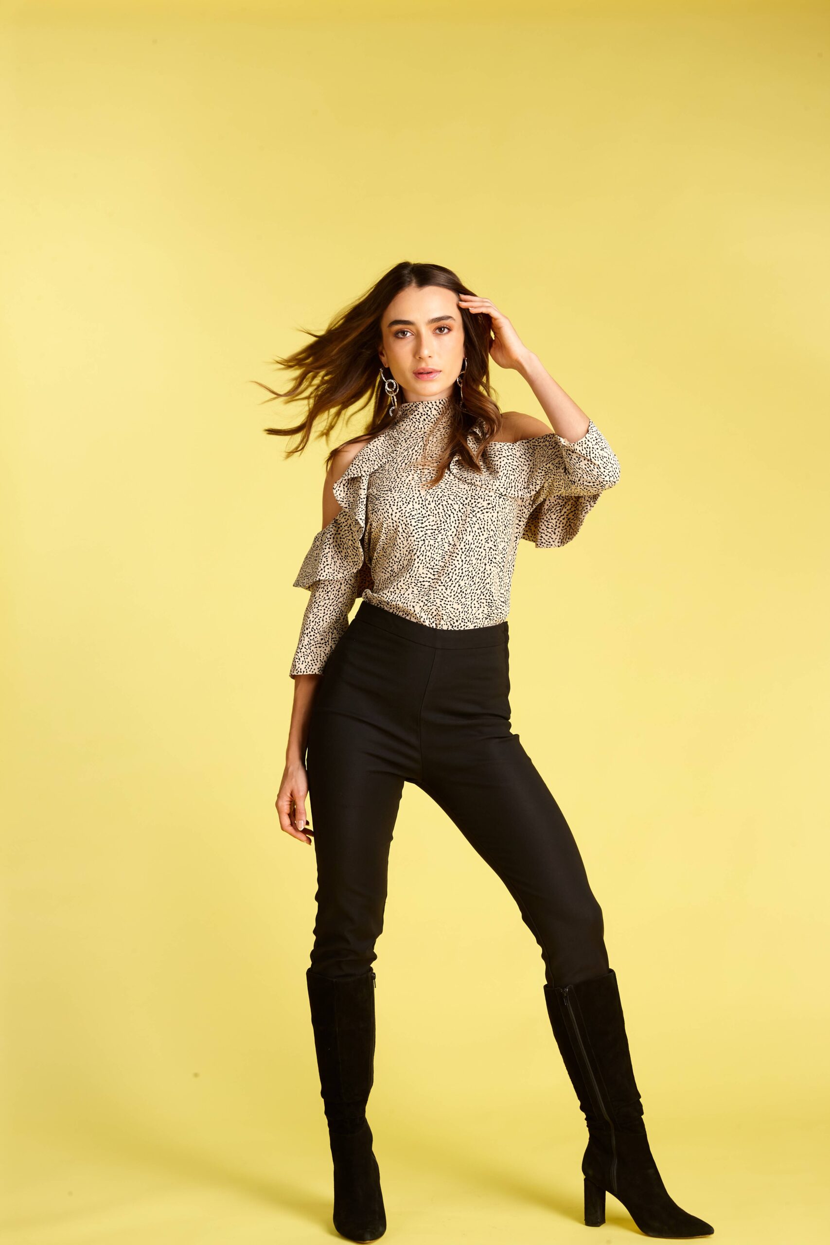 Blusa edición especial 9o aniversario, cuello redondo, off shoulder, conjunto de olanes en la parte de mangas que hacen un silueta increible. tela tacto de seda.