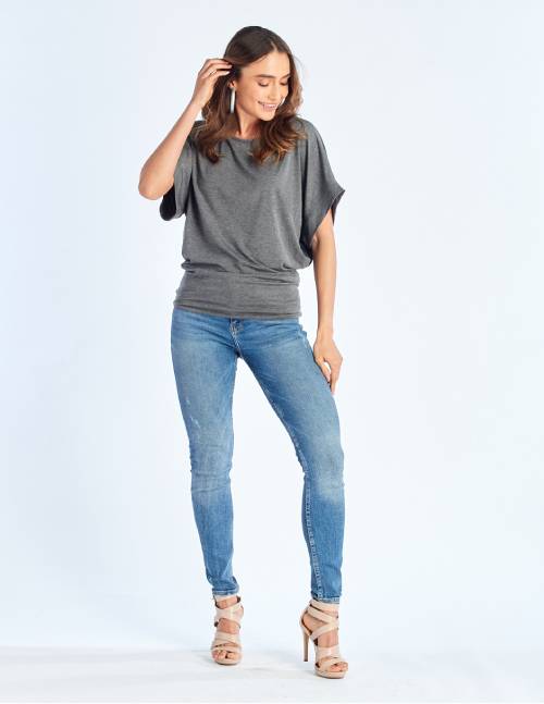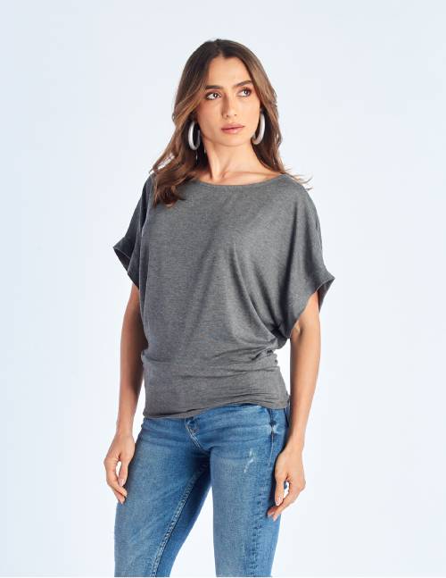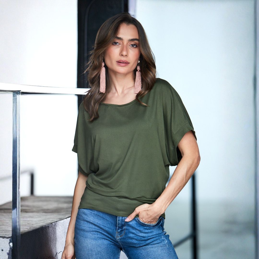 Blusa holgada de manga corta estilo murciélago. Fresca, versátil y favorecedora para cualquier silueta. Perfecta para el día a día con un toque de elegancia casual.