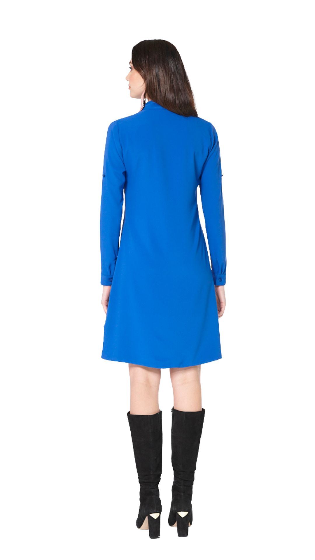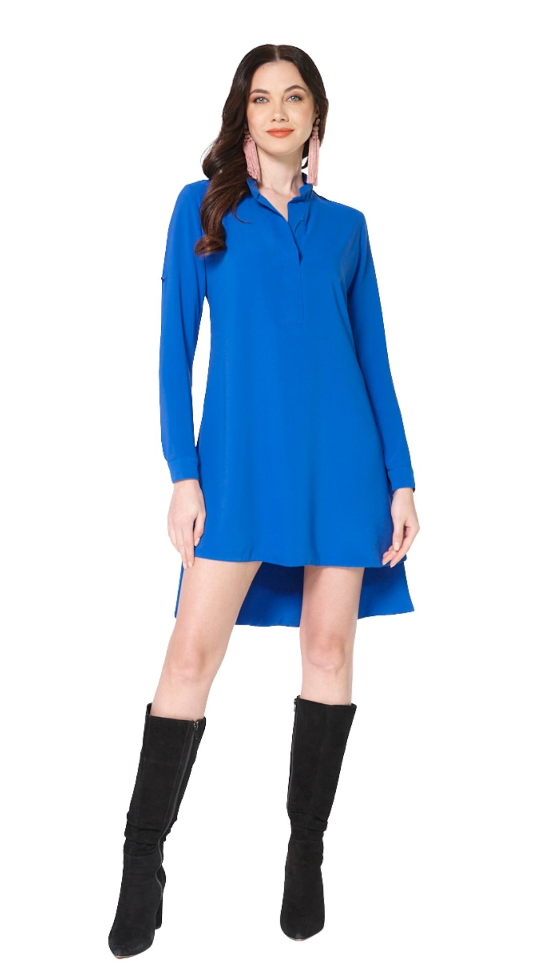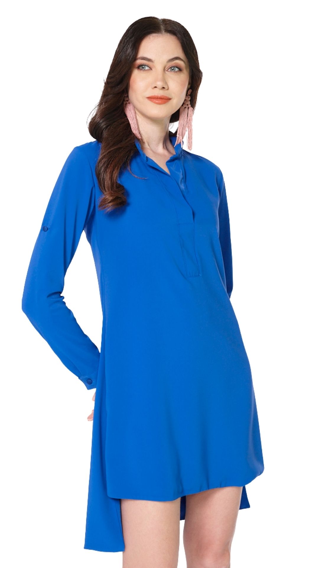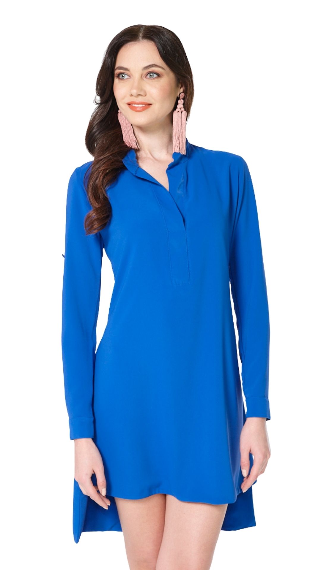 Vestido casual, corto y asimétrico, siendo mas corto al frente y las largo en la parte trasera. cuenta con escote en v. sus mangas son 3/4 pero cuenta con unas cintas para poder hacer las más cortas y abotonarlas en el brazo. tela tacto de seda con una caida muy linda